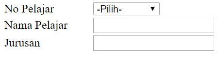 Berikut adalah paparan apabila salah satu No Pelajar dipilih. Nama Pelajar serta Jurusan akan dipaparkan pada textfield.
